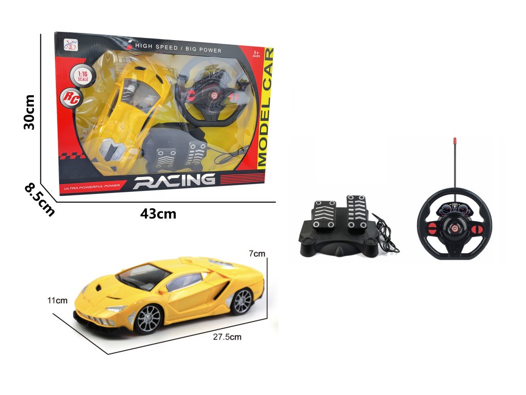 Auto na diaľkové ovládanie 1:16 pretekársky model s volantom a pedálmi žlté
