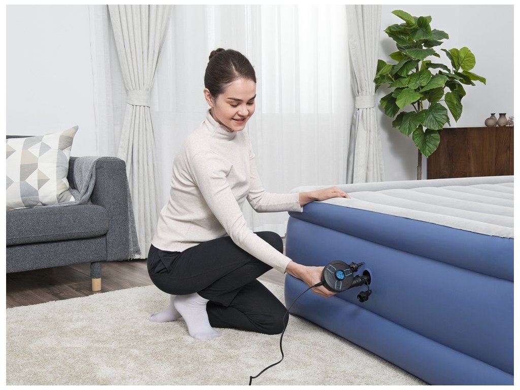 Pumpa môže byť napájaná z domácej zásuvky 100-240V alebo z autozásuvky 12V. Disponuje veľkou komorou, ktorá zaisťuje rýchle nafukovanie.