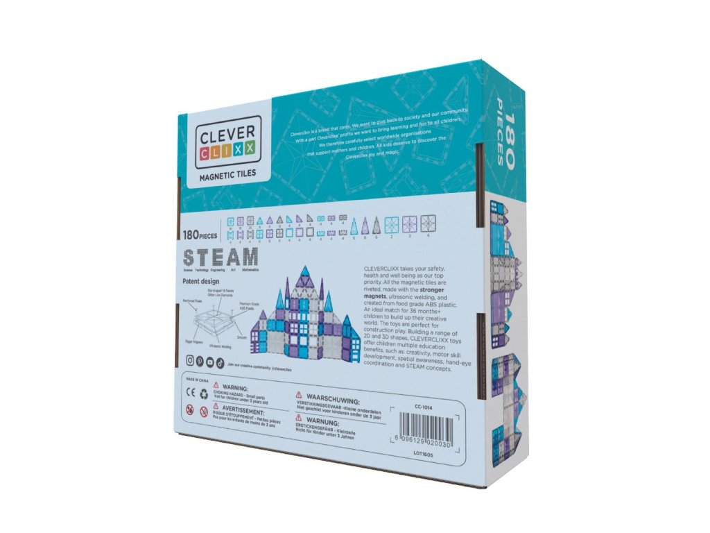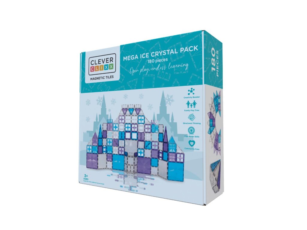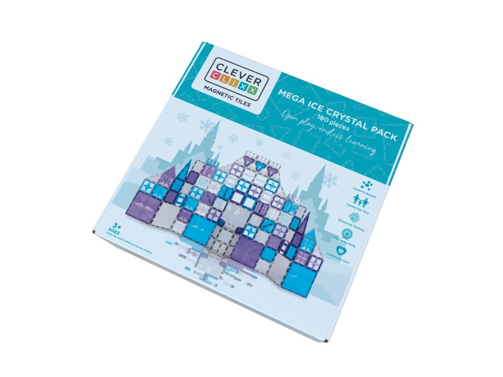 Vstúpte do sveta ľadovej fantázie s magnetickou stavebnicou Cleverclixx Krištáľová súprava. Táto 180-dielna kolekcia v bielej, modrej a fialovej farbe je ako stvorená pre stavby inšpirované zimou – od trblietavých zámkov cez snehové kupoly až po ľadové kráľovstvá. Vďaka silným magnetom dieliky ľahko držia pohromade a umožňujú stavať v 2D aj 3D.