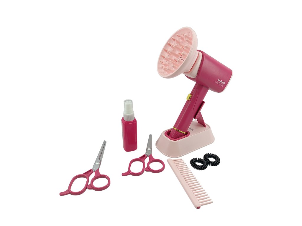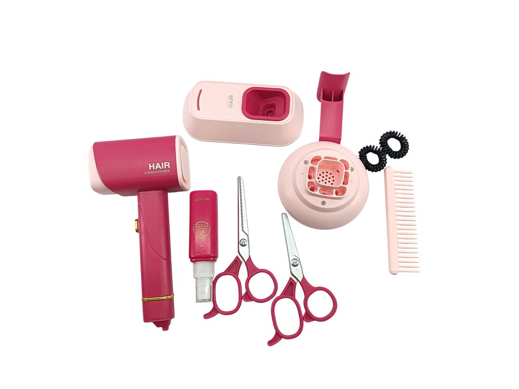 - Obsahuje: fén so zvukom a svetlom, nožnice, hrebene, fľaštičku, gumičky a ďalšie doplnky