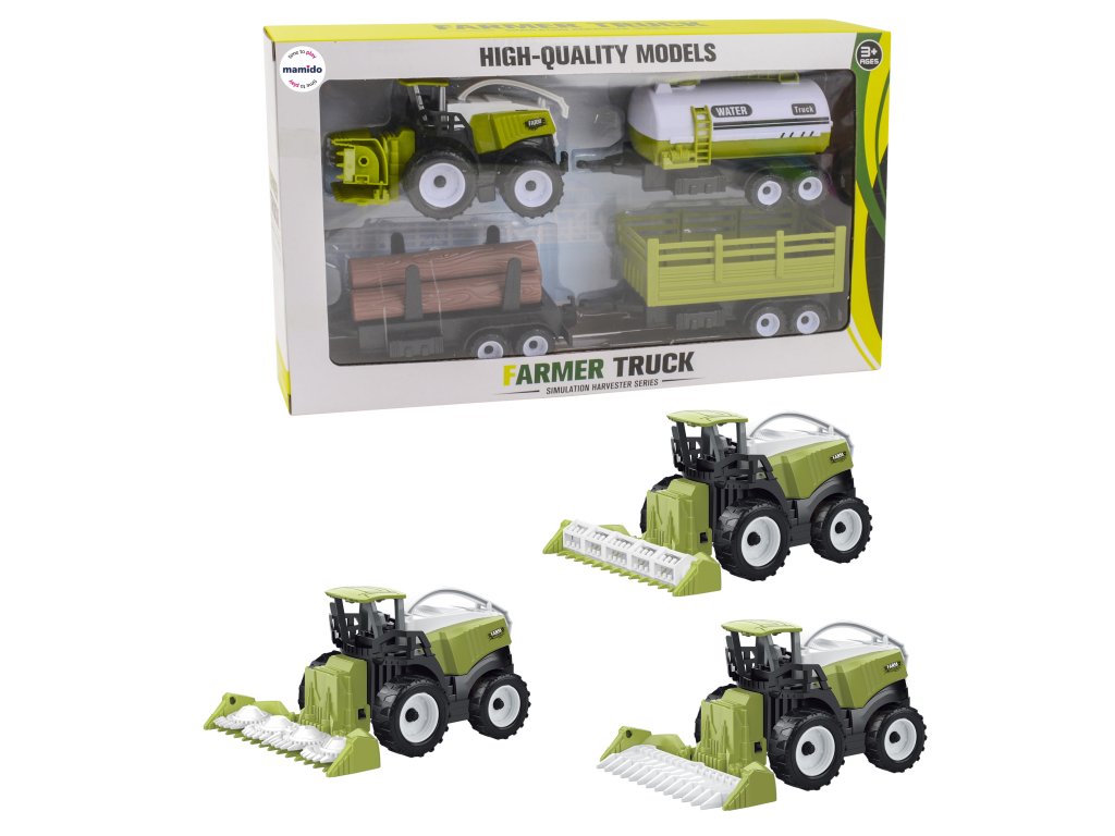 Realistická sada farmářských strojů potěší všechny malé milovníky zemědělské techniky. Hlavní součástí je kombajn se žací lištou, doplněný o tři různé vlečky – cisternu na vodu, přívěs na dřevo a nákladní farmářský vlek. Díky detailnímu provedení a robustnímu designu si děti mohou užít zábavu při hrách na farmáře.