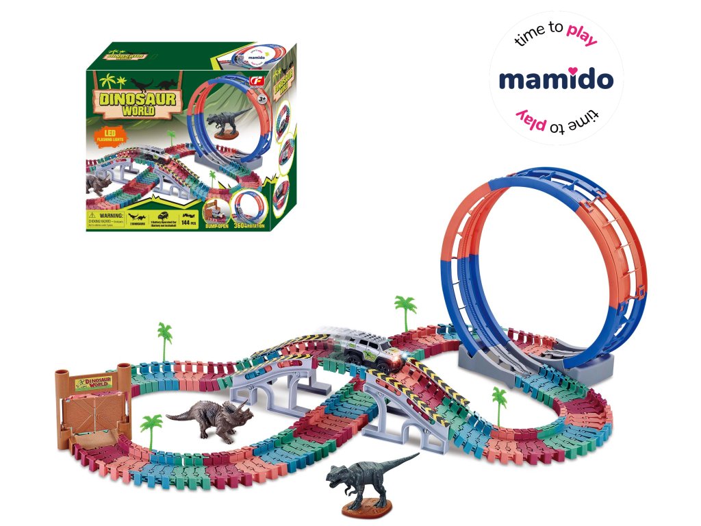 Dobrodružná závodná dráha s motívom dinosaurov v žiarivých farbách prináša napínavú jazdu cez veľkú slučku, mosty a prekážky. Autíčko so svetelnými efektmi prechádza po ohybných dielikoch, ktoré sa dajú ľubovoľne prestavovať a vytvárať nové trate. Súčasťou setu sú aj figúrky dinosaurov pre ešte realistickejšiu atmosféru divokého pralesa. Dráha je skvelá na rozvoj fantázie, jemnej motoriky a tvorivosti – deti môžu stavať stále nové kombinácie.