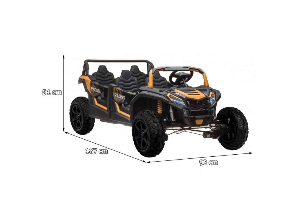 Elektrické autíčko Buggy so štyrmi silnými motormi s celkovým výkonom 600W nesmie chýbať v žiadnej detskej garáži. Autíčko je poháňané batériou s kapacitou 24V 15.6Ah (LI-ión). Maximálne zaťaženie vozítka je 120 kg. Počas jazdy dieťa určite zaujme hudobný panel s MP3, Bluetooth, USB a vopred nahranými melódiami.