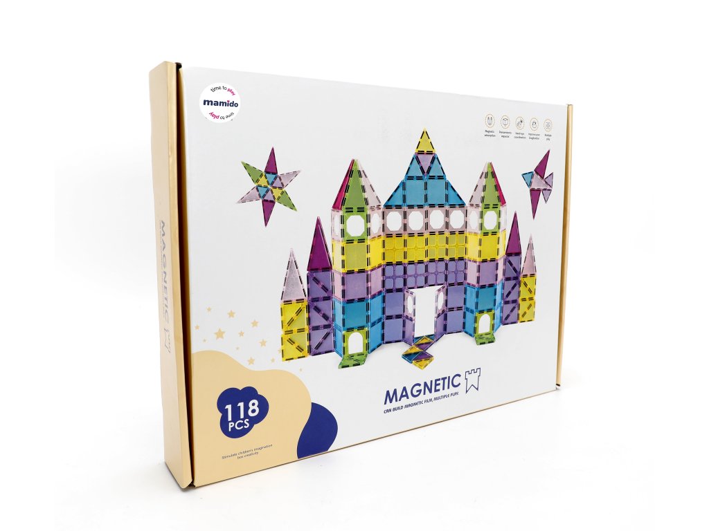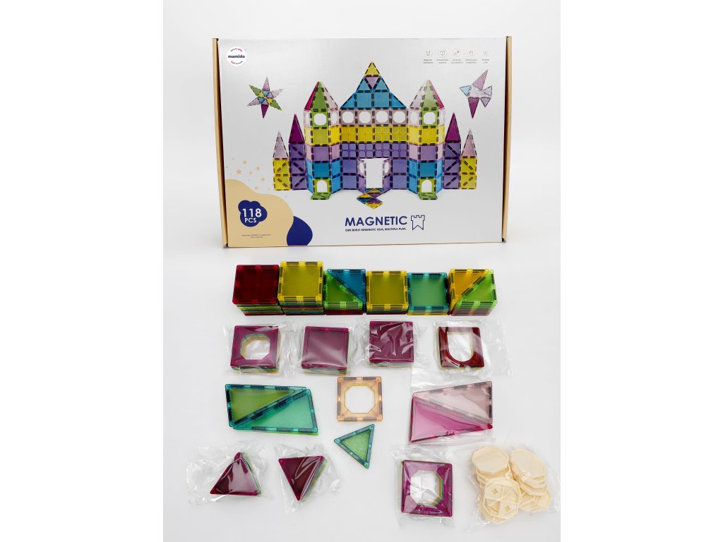 Kúzelná súprava 118 magnetických dlaždíc s veľkosťou 7,5 cm otvára svet fantázie, kde môžu deti stavať hrady, domčeky, veže aj vlastné farebné svety. Priehľadné dieliky vytvárajú krásne svetelné efekty a skvele držia vďaka silným magnetom. Stavebnica je ideálna pre malých staviteľov, ktorí milujú kreatívne kombinovanie tvarov.