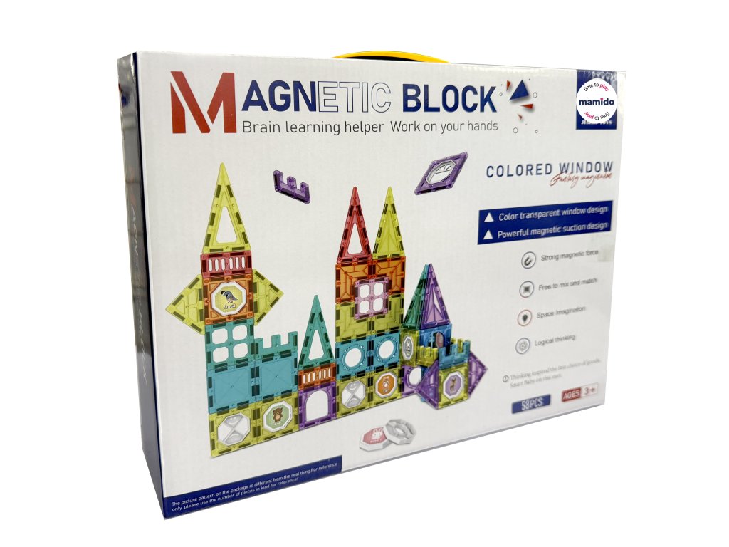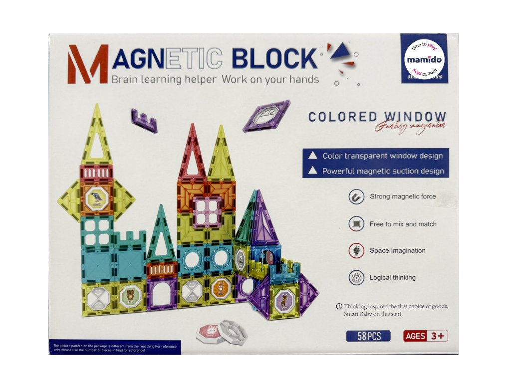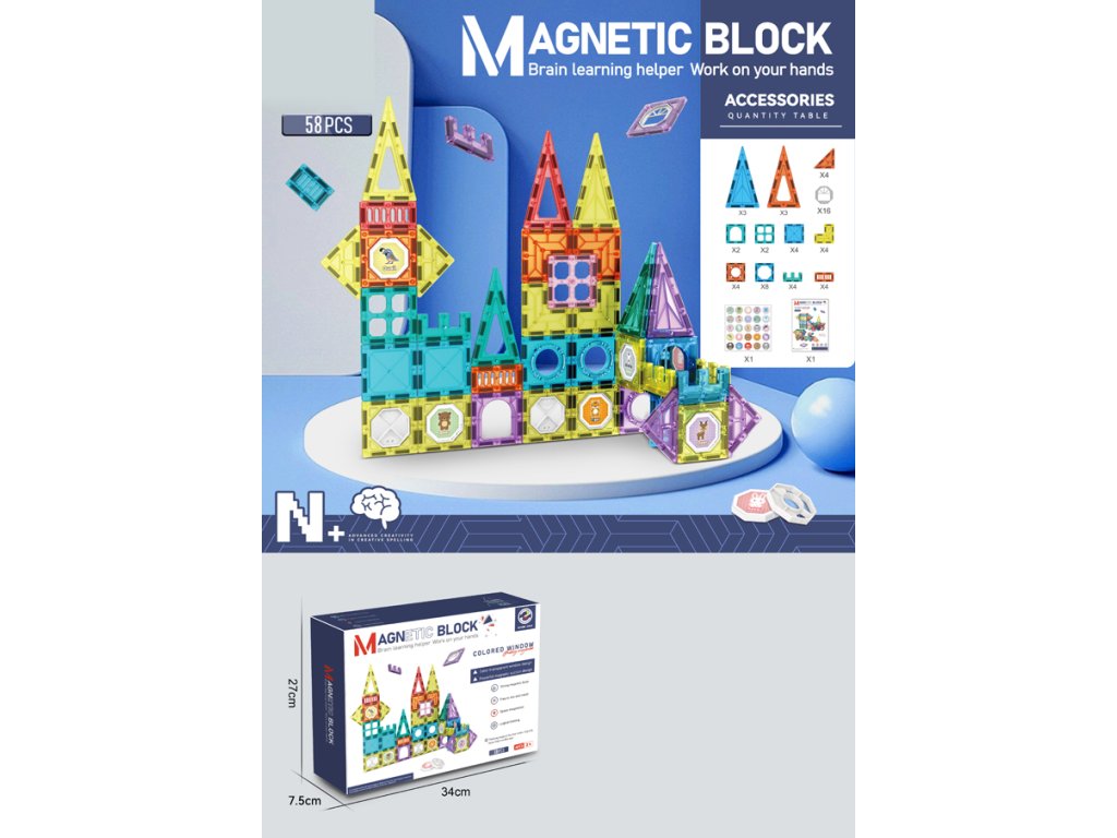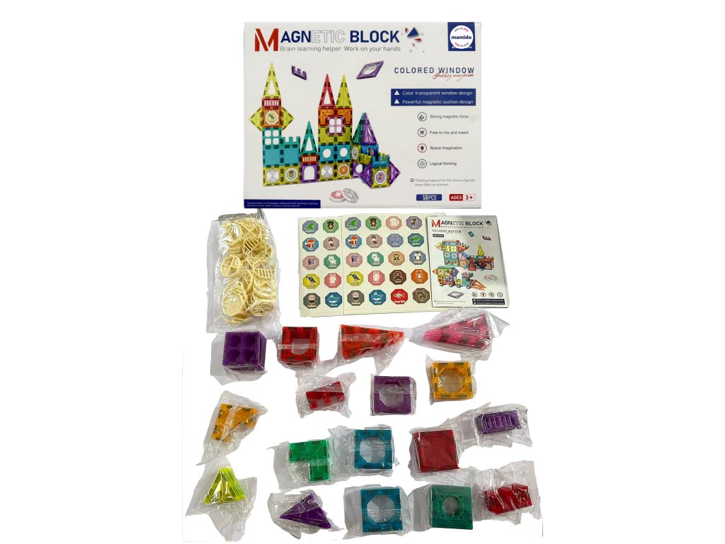 Stavebnica obsahuje 58 magnetických dielikov rôznych tvarov – trojuholníky, štvorce, oblúky, dlhé panely, dekoratívne okienka aj špeciálne diely. Transparentné prevedenie v žiarivých farbách podporuje vizuálne vnímanie a vďaka jednoduchému spájaniu si s ňou poradia aj menšie deti. Ideálne pre rozvoj kreativity, logického myslenia a priestorovej predstavivosti.