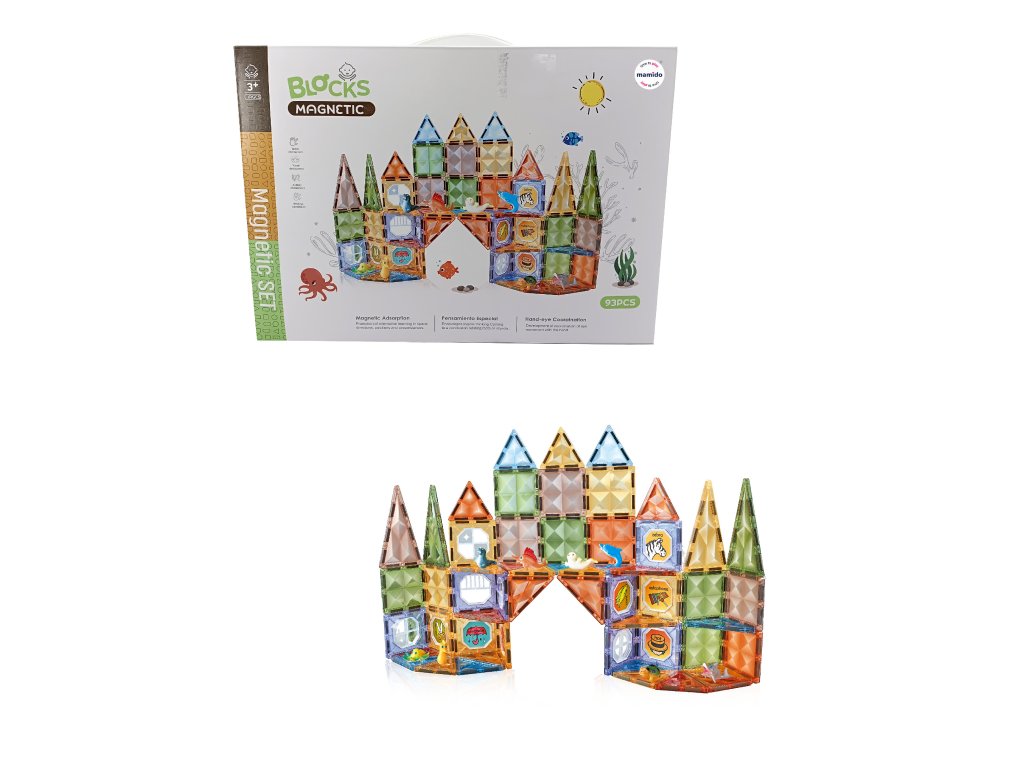 Farebná magnetická stavebnica podmorský svet prináša 93 dielikov vo veľkosti 7,5 cm, ktoré umožňujú deťom stavať hrady, veže, morské paláce aj fantazijné stavby inšpirované podmorským svetom. Kombinácia priehľadných farebných dielikov a tematických obrázkov vytvára krásne efekty a podporuje kreatívne hranie.
