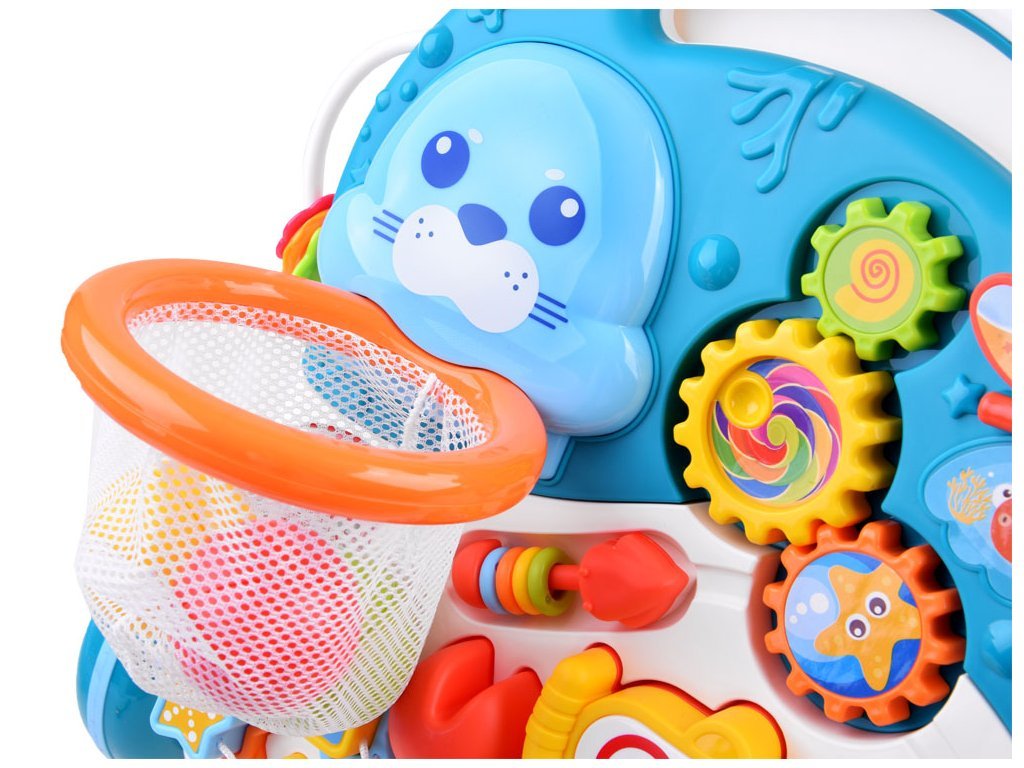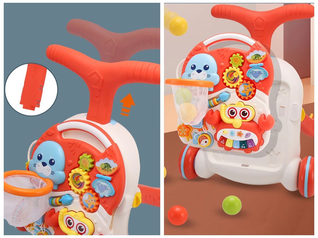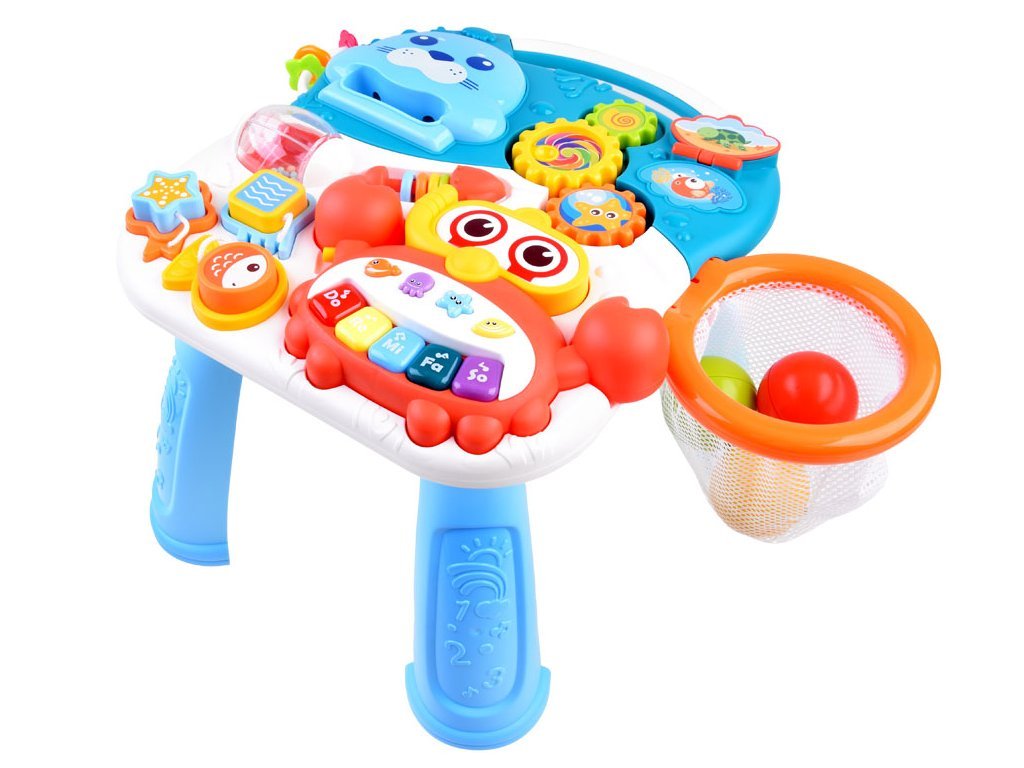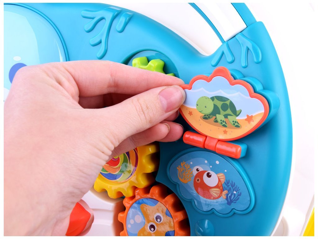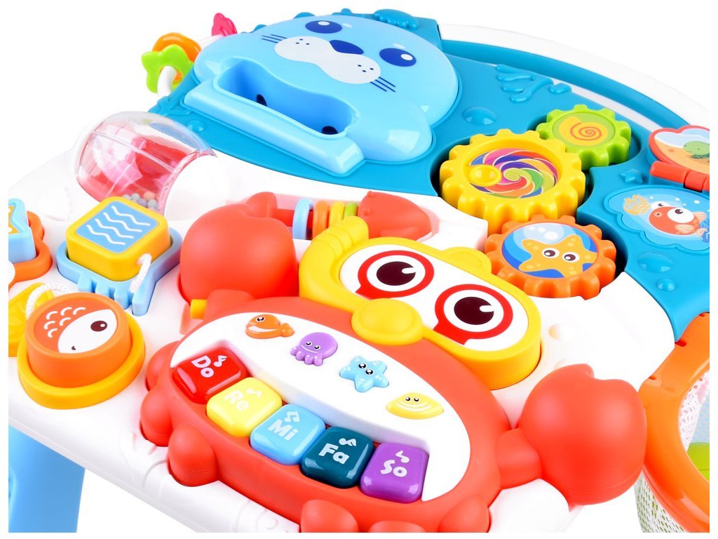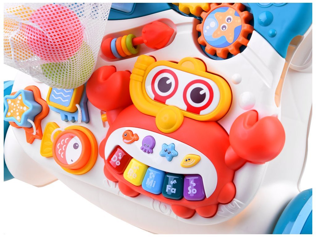 - Krab: ide vybrať z chodítka, takže dieťa ho môže mať pri sebe a má aj klávesy, ktoré sú podsvietené. Na paneli kraba sú tlačidlá (veľryba, chobotnice, hviezdice a raja), ktoré hrajú veselé melódie, zvuky zvierat a osvetľujú klávesy.