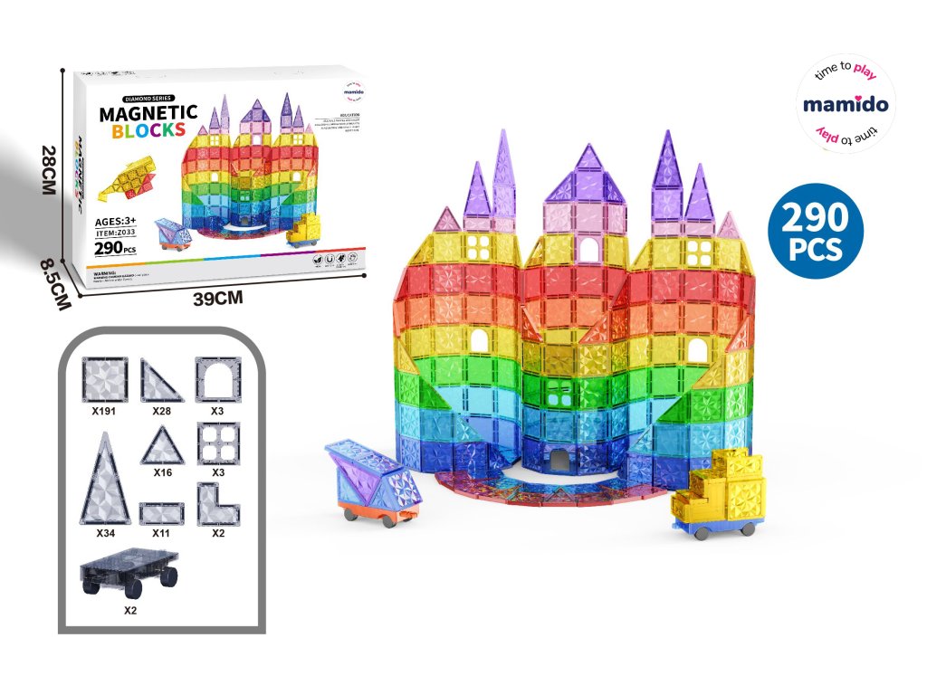 Objavte nekonečné možnosti tvorenia s magnetickou stavebnicou s 290 dielmi. Farebné priehľadné kocky s diamantovým povrchom sa ľahko spájajú vďaka silným magnetom a umožňujú stavať vysoké hrady, mosty, veže aj vozidlá. Deti pri hre rozvíjajú kreativitu, priestorovú predstavivosť a jemnú motoriku.