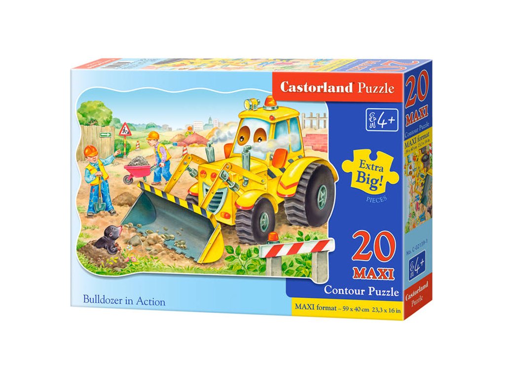 Puzzle 20 elementov MAXI Bulldozer v akcii C-02139 sú úžasne farebné detské puzzle, ktoré sú ideálnou voľbou pre najmladšie deti. Puzzle sa skladajú z 20 maxi dielikov . Po zložení vznikne obrázok s rozmermi 59 x 40 cm . Vysoká kvalita a estetické farby povzbudí každé dieťa na skladanie puzzlí.