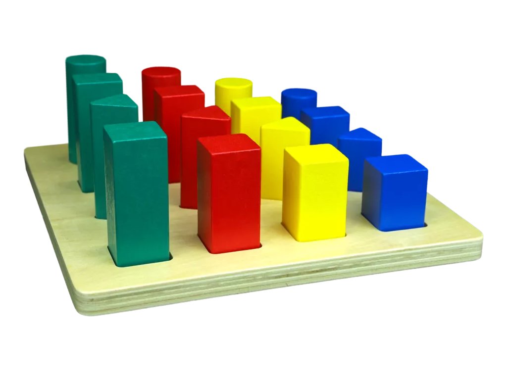 Sada obsahuje drevený podstavec a súbor geometrických telies v odlíšených farbách a výškach. Práca so sadou podporuje vizuálnu diskrimináciu tvarov, porovnávanie výšok a triedenie podľa farieb.