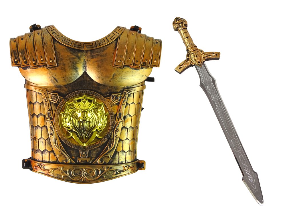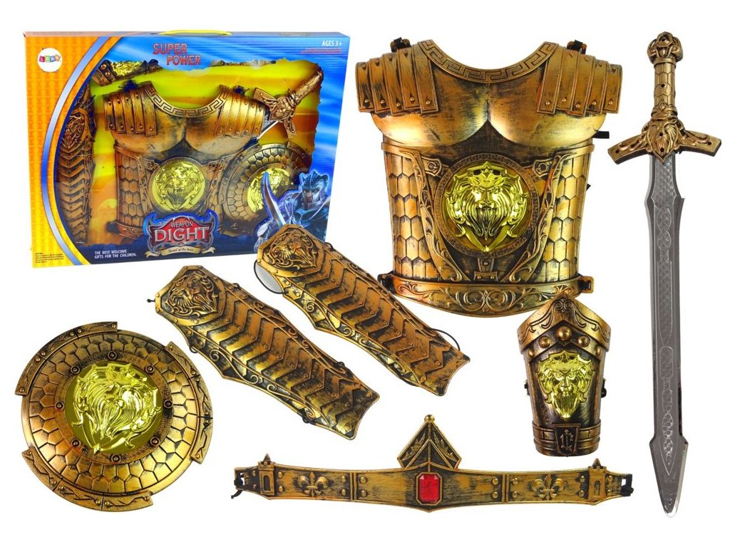 Krásne zlaté brnenie s doplnkami prenesie vaše batoľa do rozprávkového sveta. Chrániče nôh, štít a brnenie sú vyrobené z tvrdého plastu, počas bojov budú tvoriť silnú ochranu.