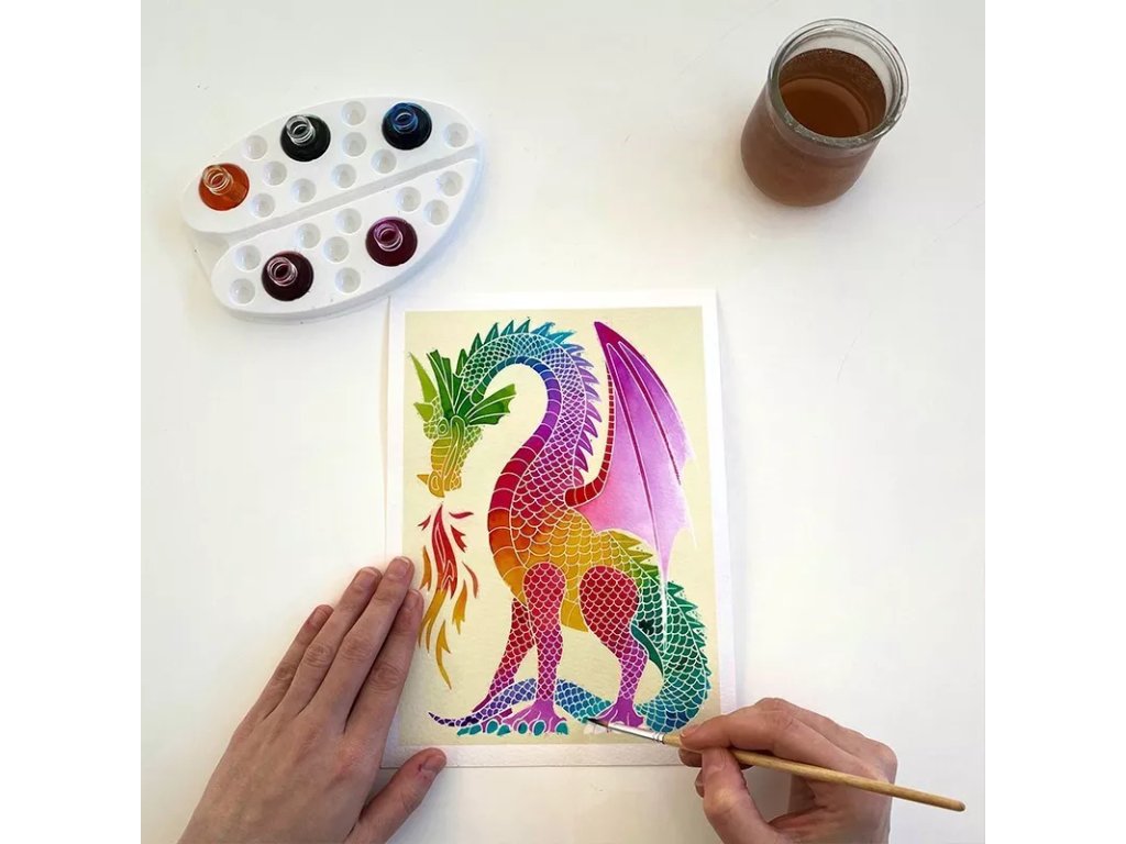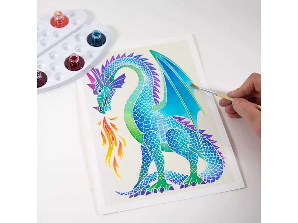 Výtvarná kreatívna súprava na maľovanie akvarelom s motívmi mýtických drakov. Súprava je navrhnutá tak, aby podporovala kreativitu a zručnosť pri práci s farbami.