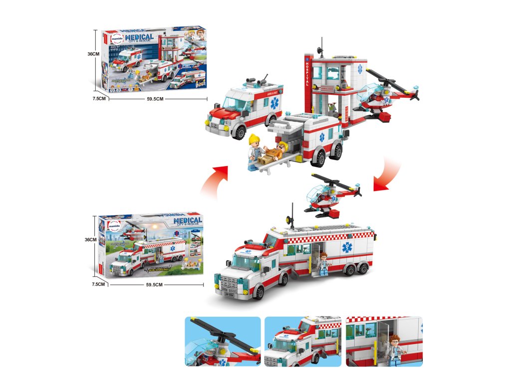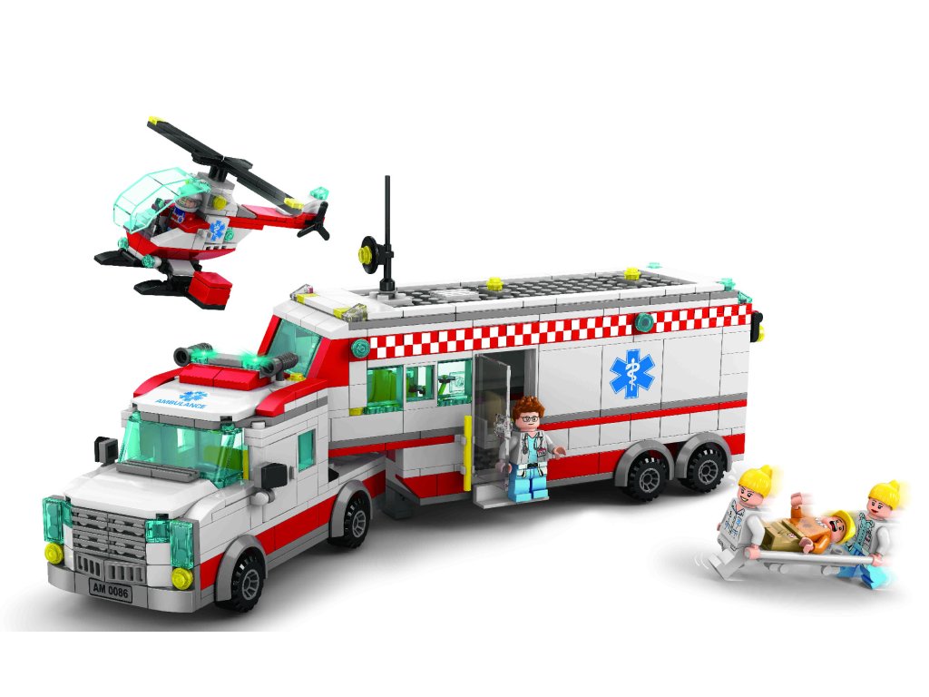 Sanitka je vybavená posuvnými dverami a priestranným interiérom, čo umožňuje ľahké vkladanie figúrok aj nosidiel. Záchranársky vrtuľník dopĺňa atmosféru akcie a podporuje fantáziu malých staviteľov.