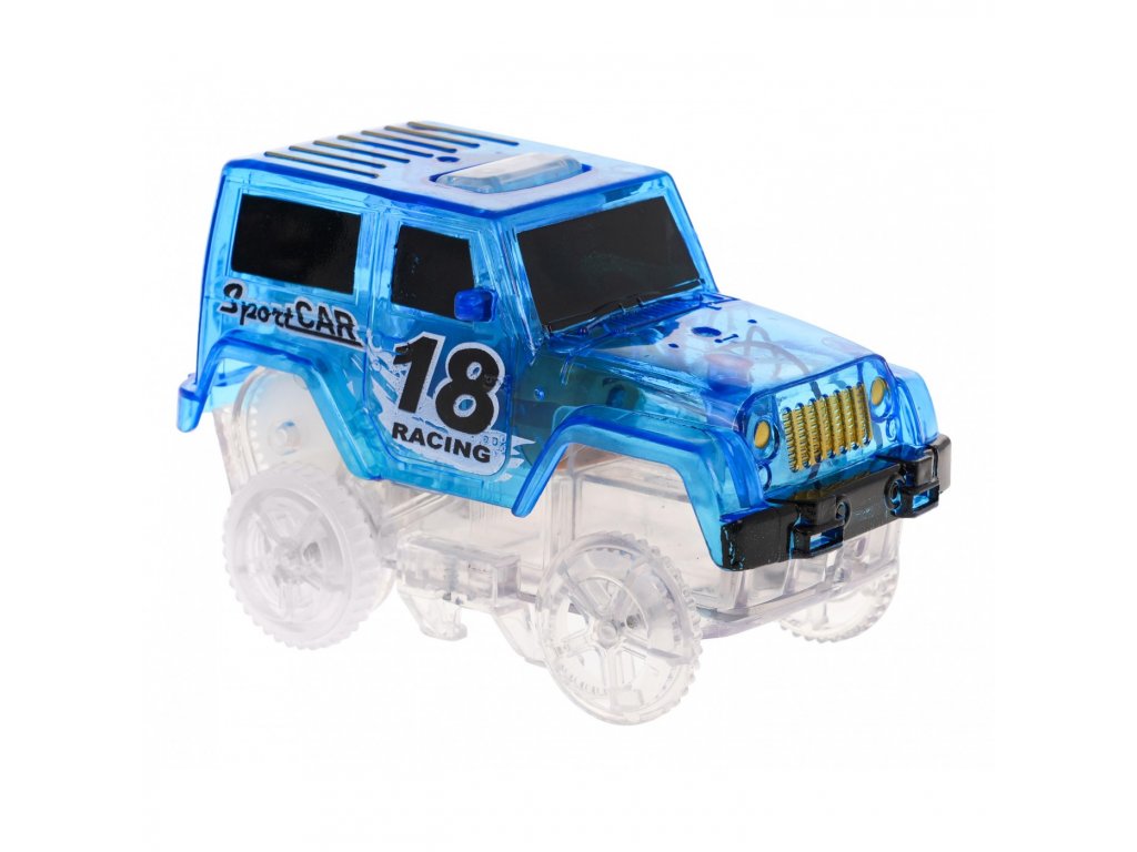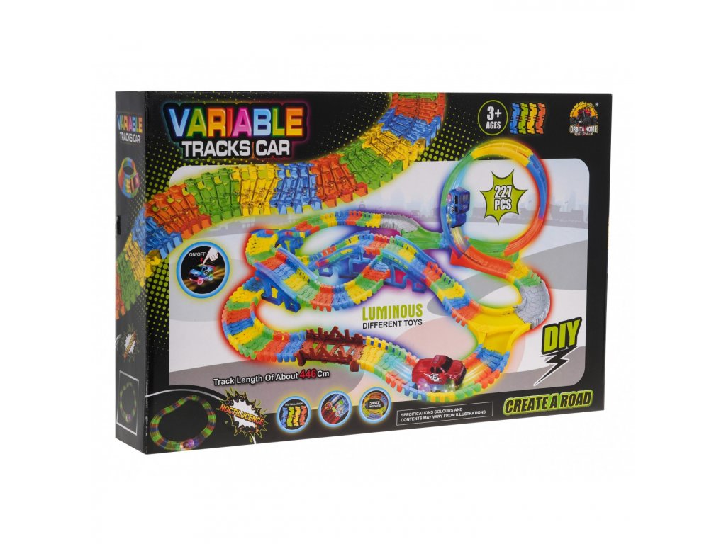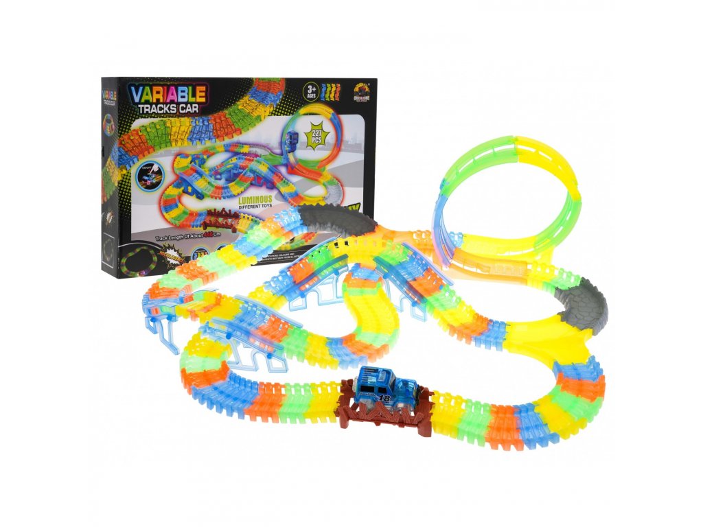 Svietiaca závodná dráha s loopingom a autíčkom je ideálna pre deti od 3 rokov. Dráhy sú pružné a je možné ich zostaviť do rôznych kombinácií, otočiť, zdvíhať a meniť dokonca aj počas jazdy autíčka. Fluorescenčné dráhy svietia v tme, čo pridáva na zábavnosti. Autíčko v sade je vybavené LED osvetlením, ktoré vytvára úžasný efekt pri jazde v tme. Autíčko je napájané dvoma AA 1,5V batériami, ktoré nie sú súčasťou balenia. Na spustenie autíčka stačí stlačiť tlačidlo na jeho streche. Celková dĺžka dráhy je 446 cm.