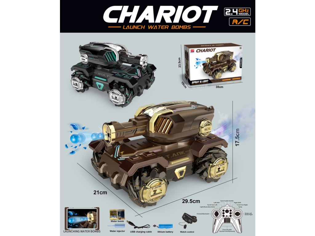 Robustný dizajn, futuristické detaily a veľká otočná veža robia z tohto modelu skutočný bojový stroj. Vozidlo vie strieľať vodné náboje, vytvárať efekt hmly, svietiť a jazdiť všetkými smermi. Ovládanie na frekvencii 2.4 GHz zaisťuje stabilný signál bez rušenia a možnosť viacerých vozidiel v jednej hre.