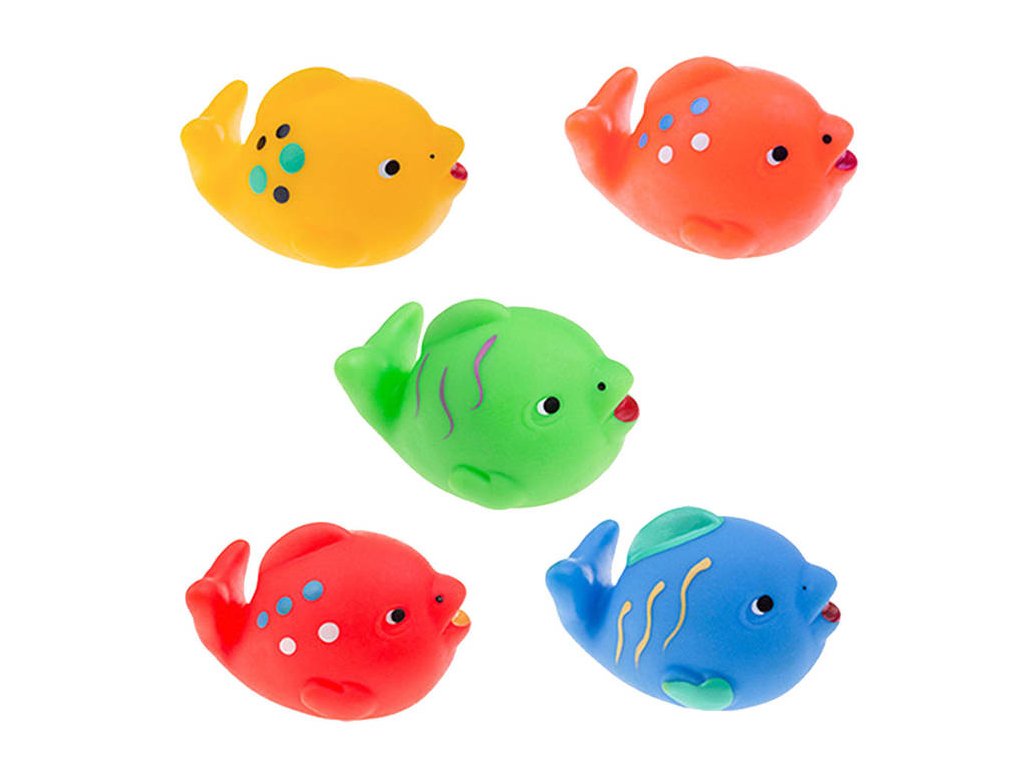 Päť gumových farebných rybičiek skvele poslúži pri hraní vo vode. Sada mäkkých, gumových rybičiek, ktoré sa nenaplnia vodou, zaistia veľa radosti počas napríklad večerného kúpeľa. Overte si náš široký výber gumových hračiek do vody.