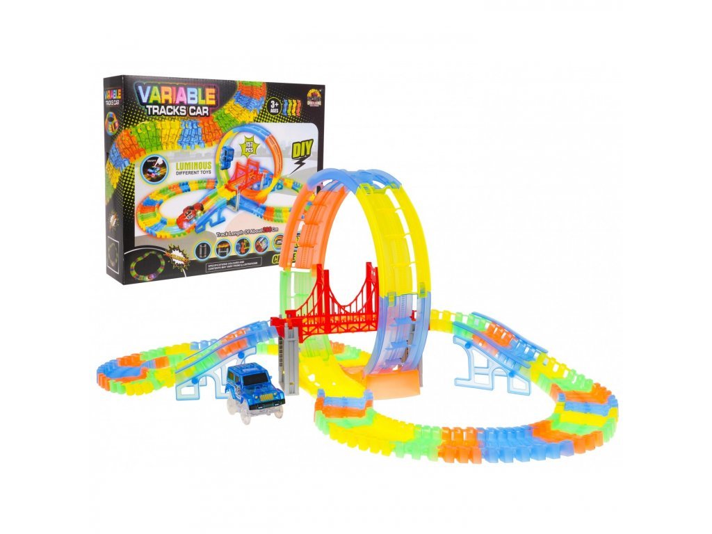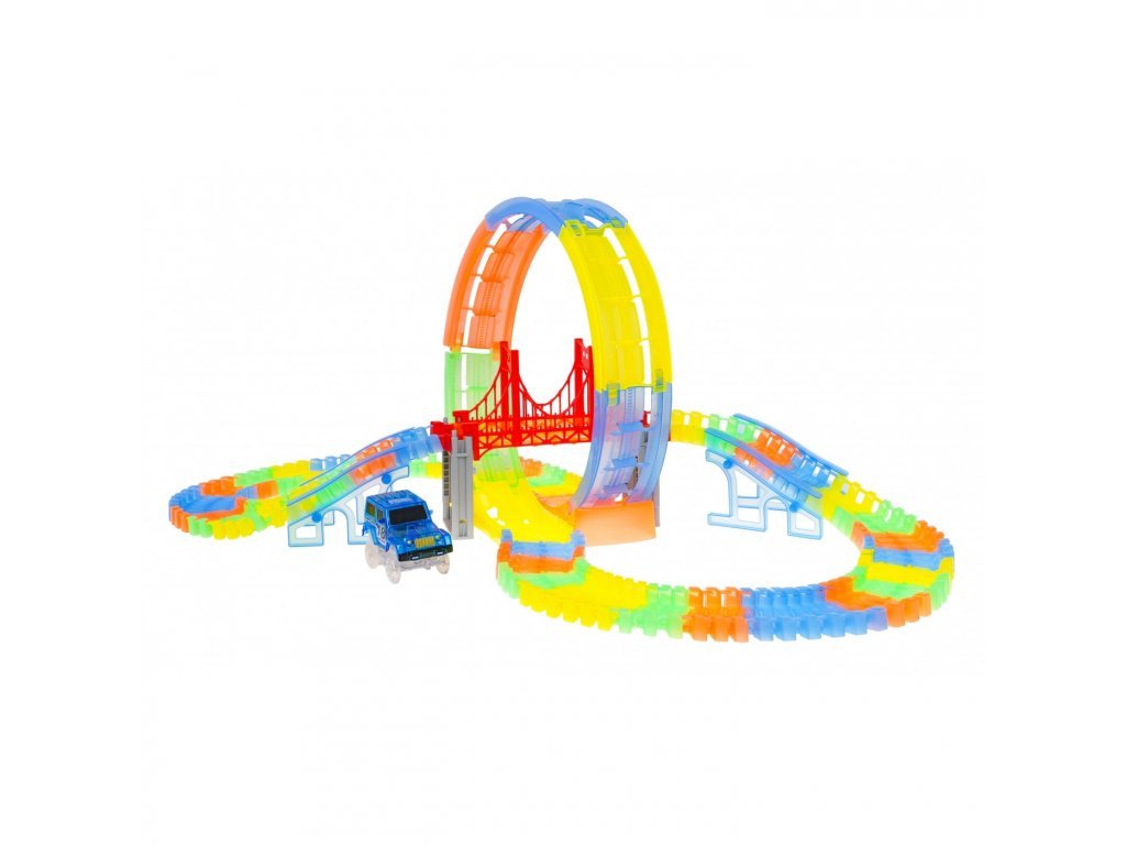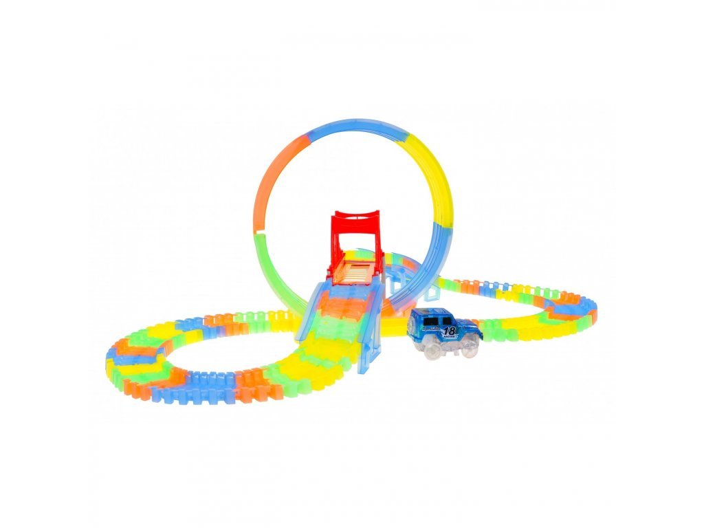 Svietiaca dráha v temnote s okruhom a priloženým autíčkom je skvelým darčekom pre deti už od 3 rokov veku. Dráhy sú flexibilné, čo umožňuje rôzne kombinácie - môžete ich otáčať, zdvíhať, prekladať, a to dokonca aj počas jazdy autíčka. Navyše sú dráhy fluoreskujúce a svietia v temnote. Vozidlo v sete má LED podsvietenie , čo vytvára ohromujúci efekt počas jazdy v temnote. Autíčko je napájané batériami 2 x AA 1,5V (nie sú súčasťou balenia). Na spustenie autíčka jednoducho stlačte tlačidlo na jeho streche.